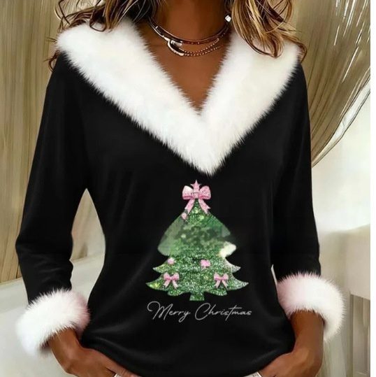 Women’s Christmas Print Fur Collar Spliced V-neck T-shirt