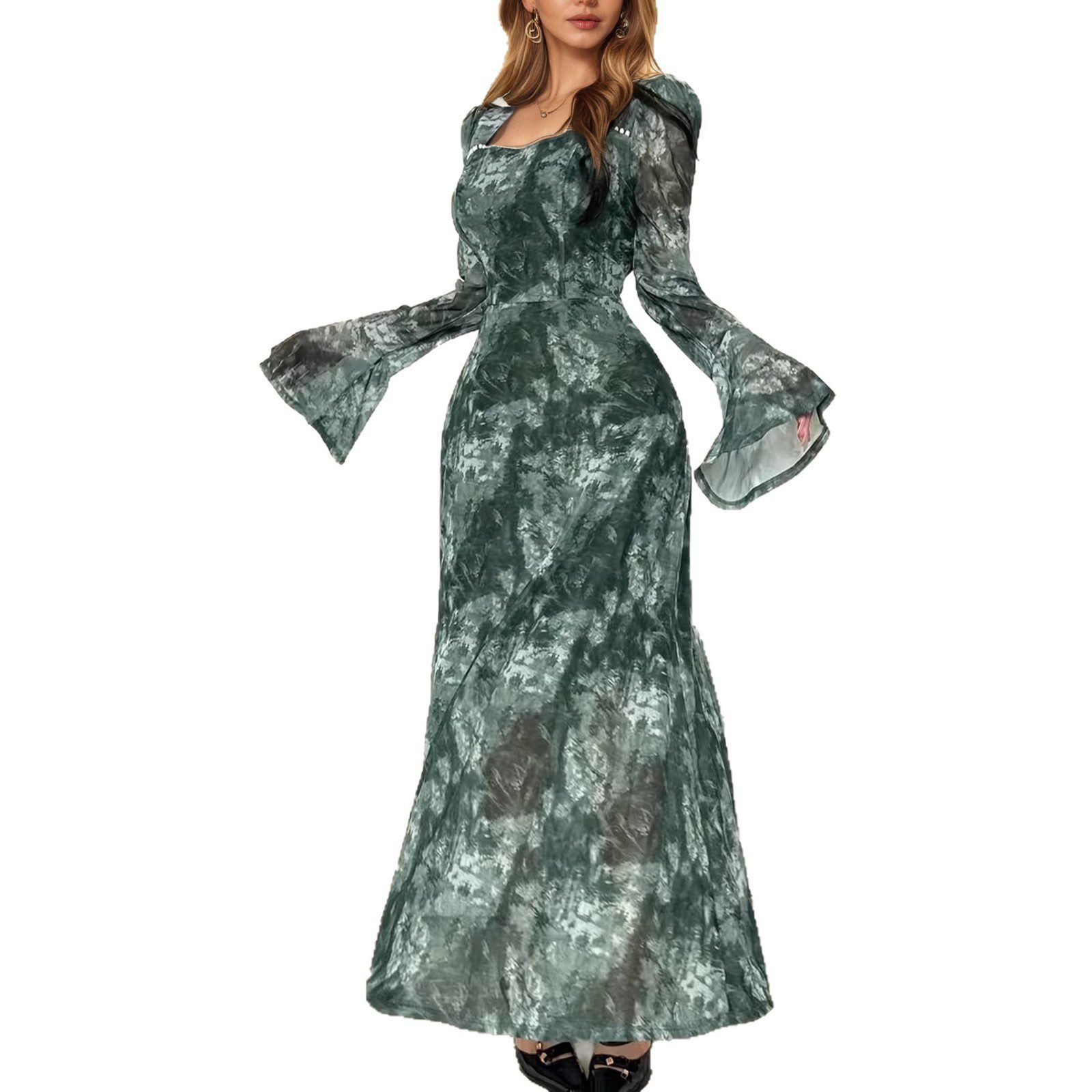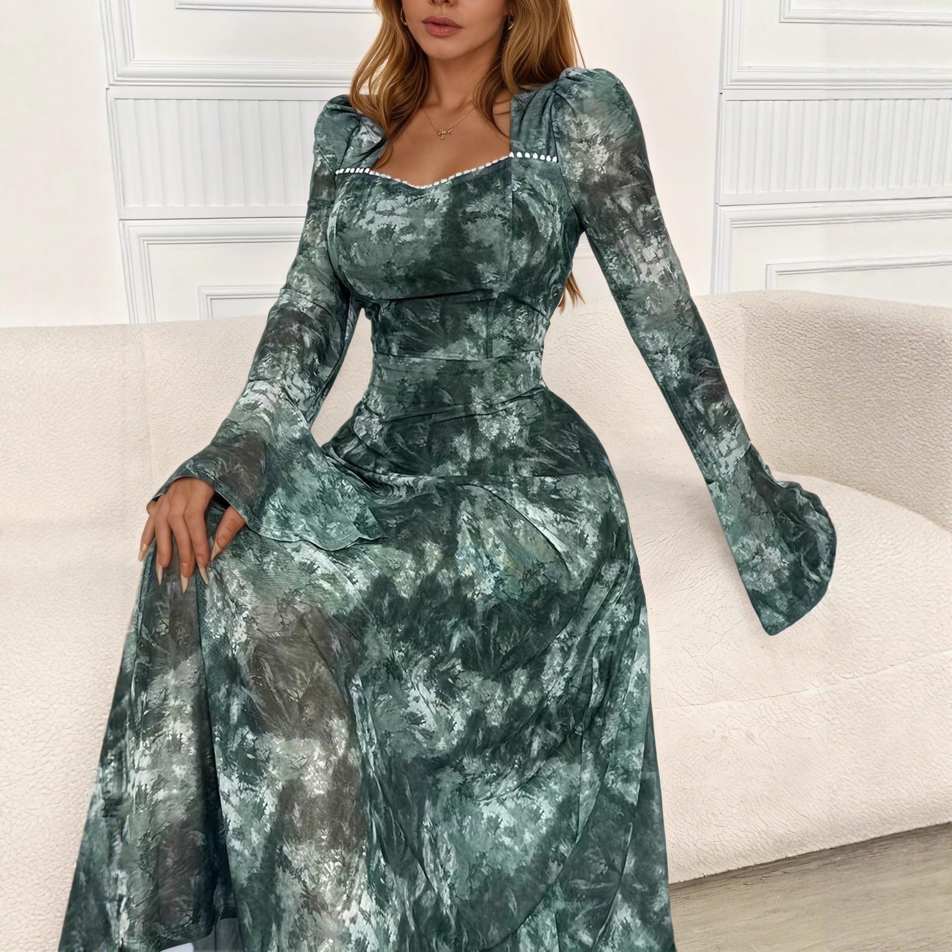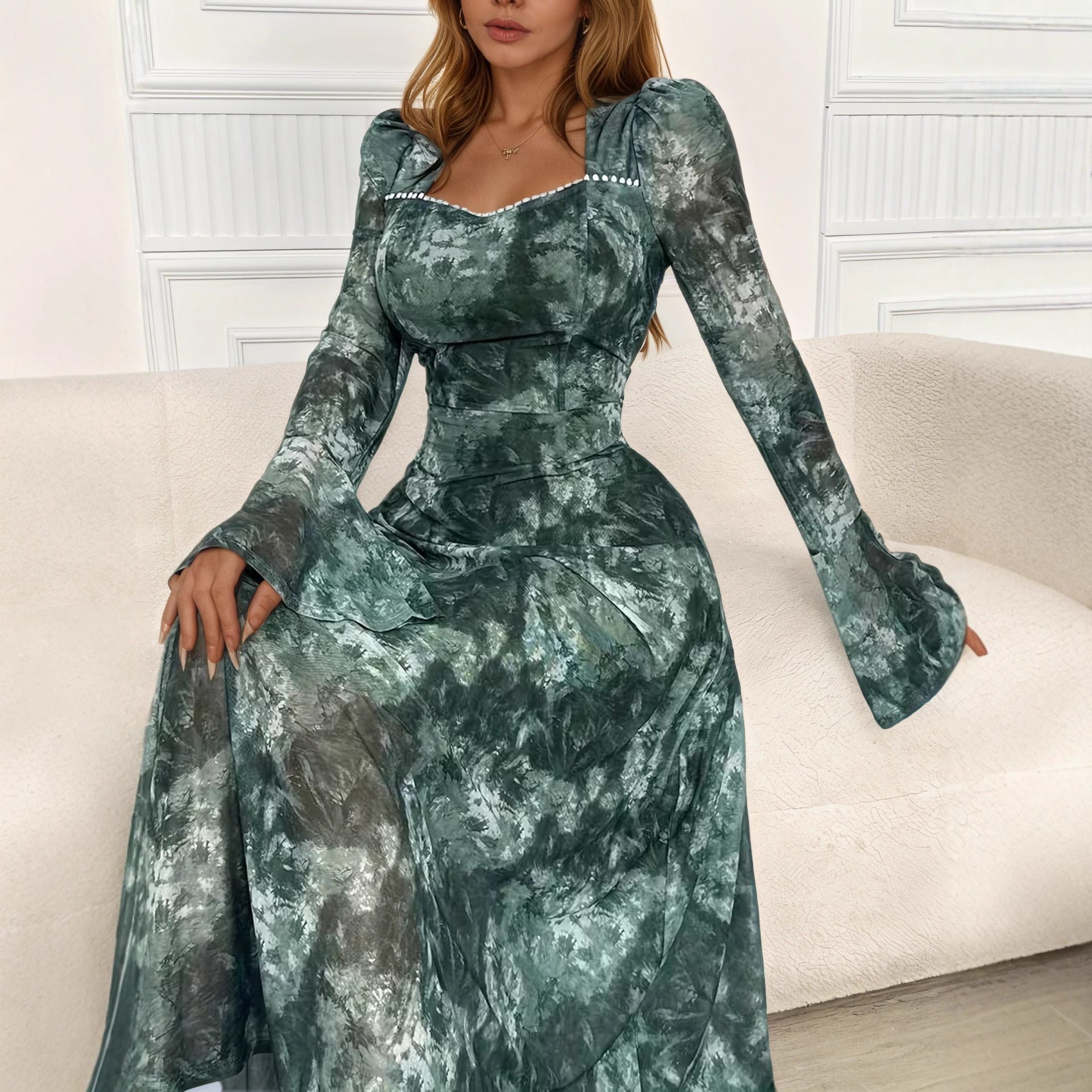 Elegant Square-neck Long-sleeve Tie-dye Printed Dress