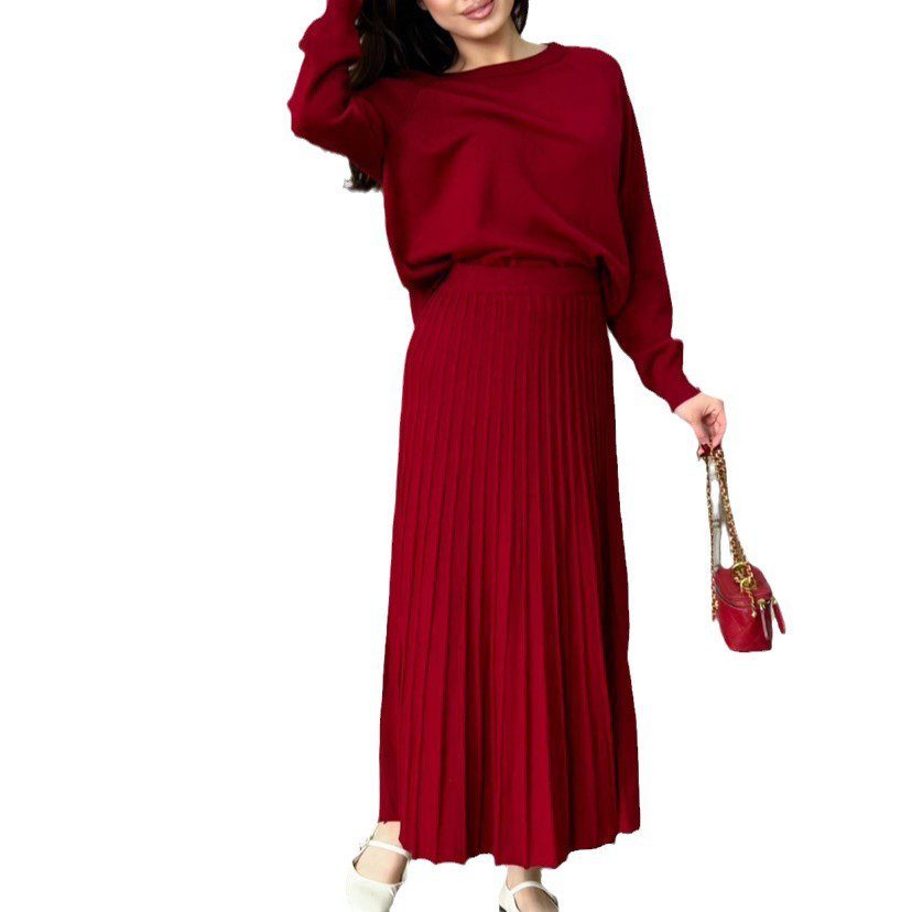 Women’s Fashion Round Neck Solid Color Long Sleeved Pleated Skirt Set