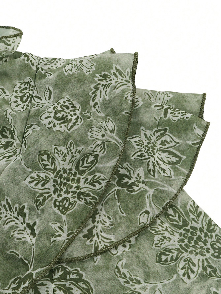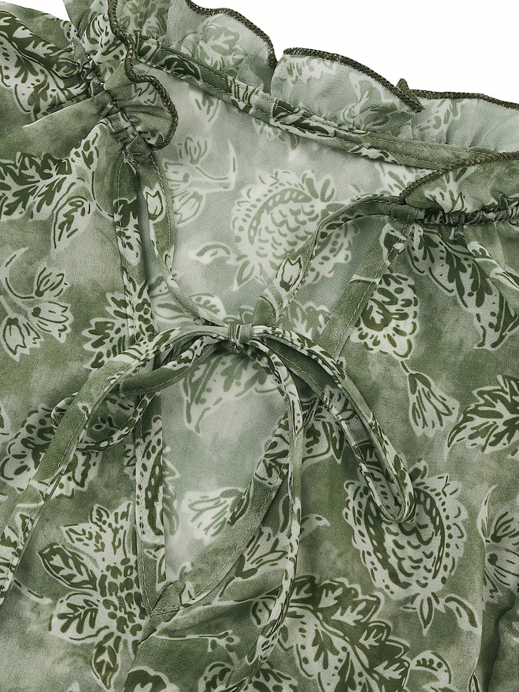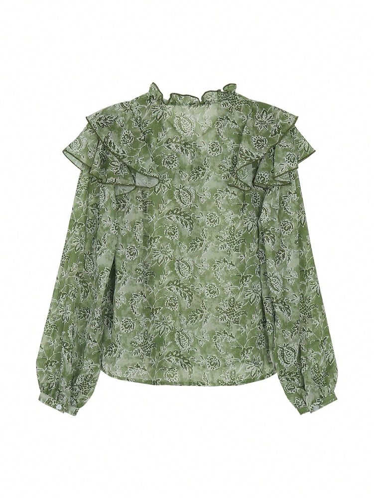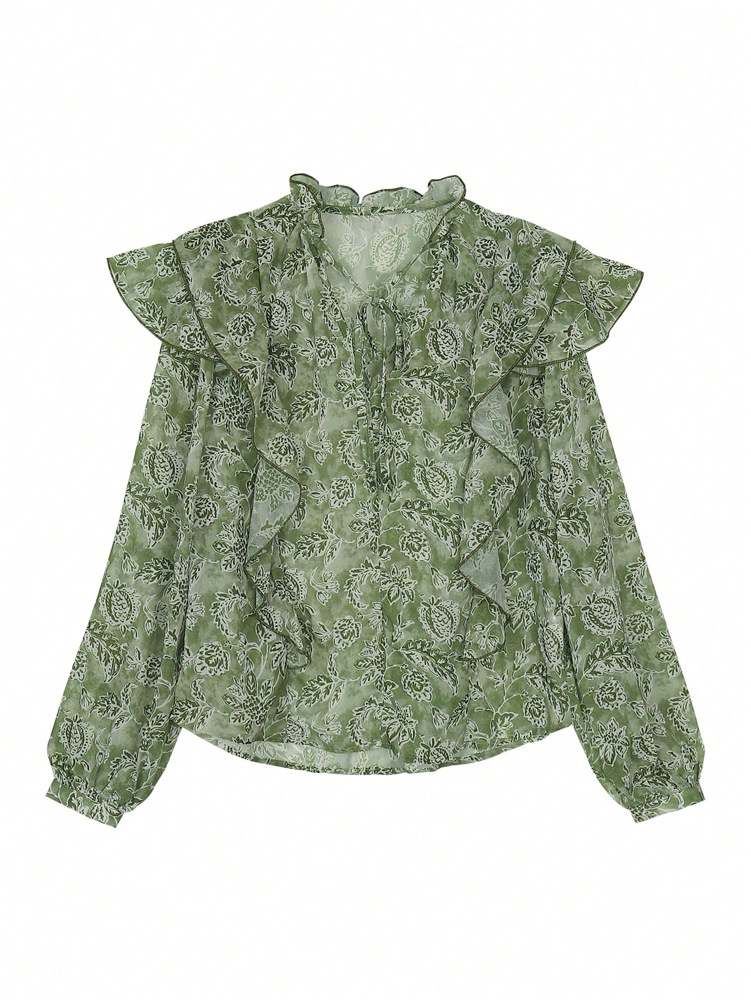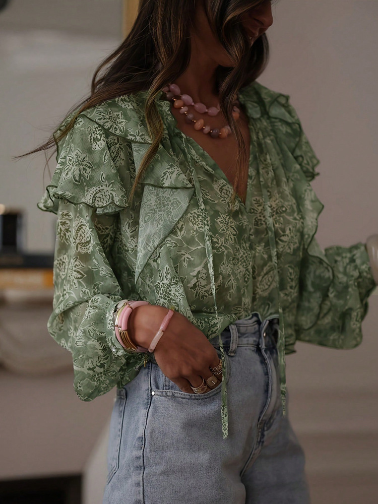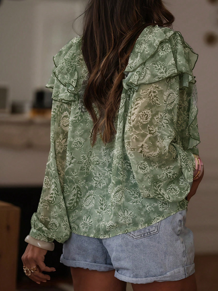 Womens Floral Print V-Neck Long-Sleeve Patchwork Ruffle-Trim Loose Shirt