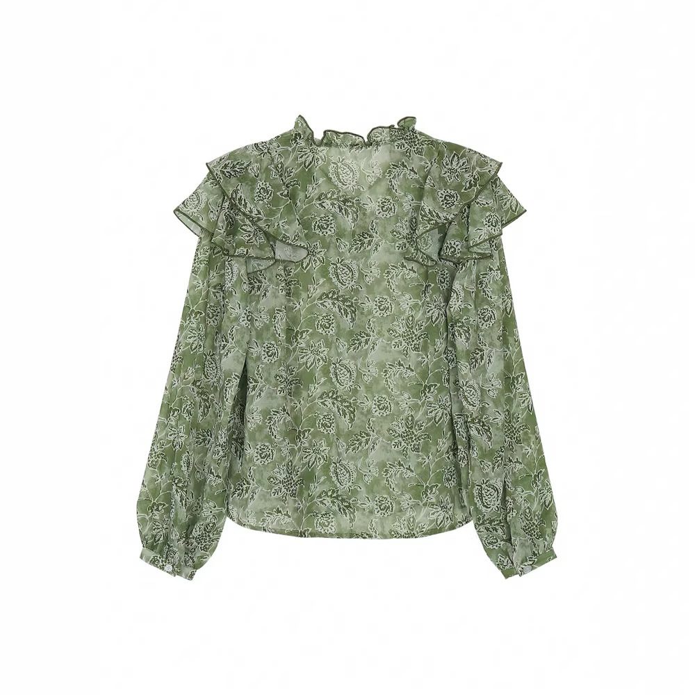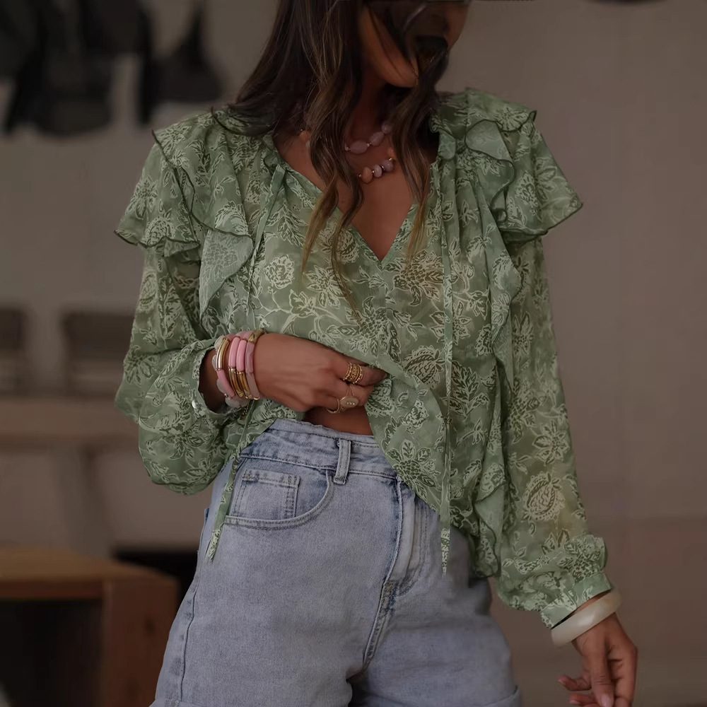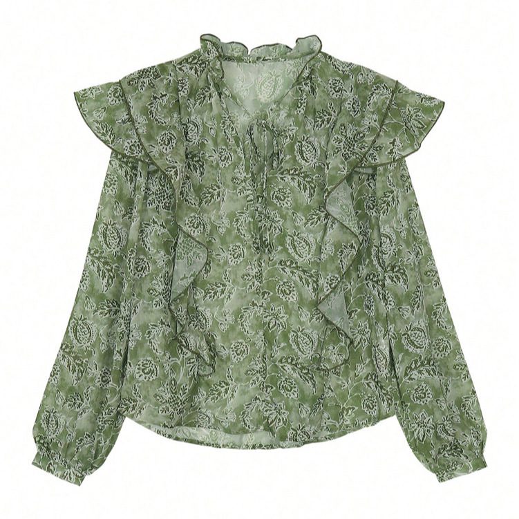 Womens Floral Print V-Neck Long-Sleeve Patchwork Ruffle-Trim Loose Shirt