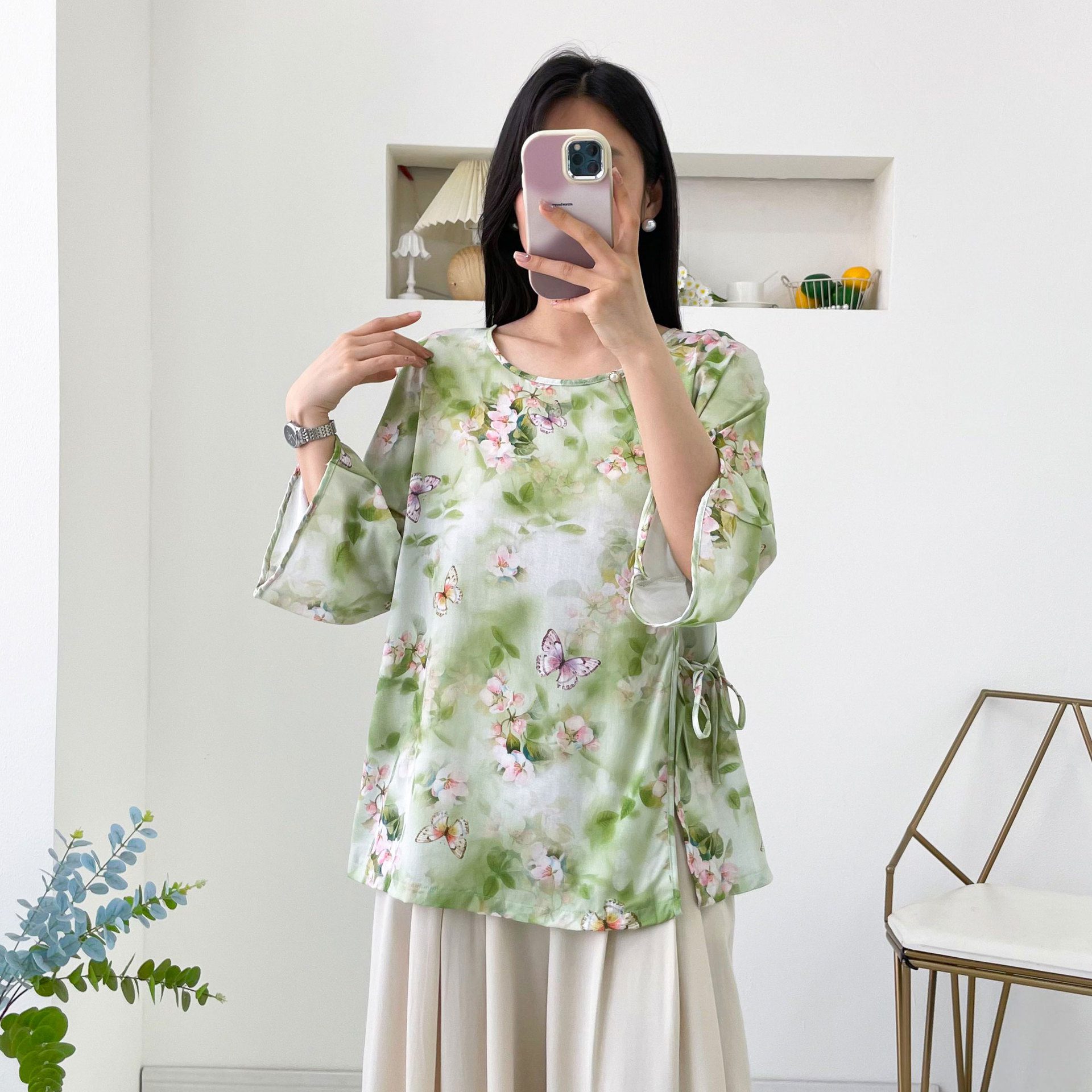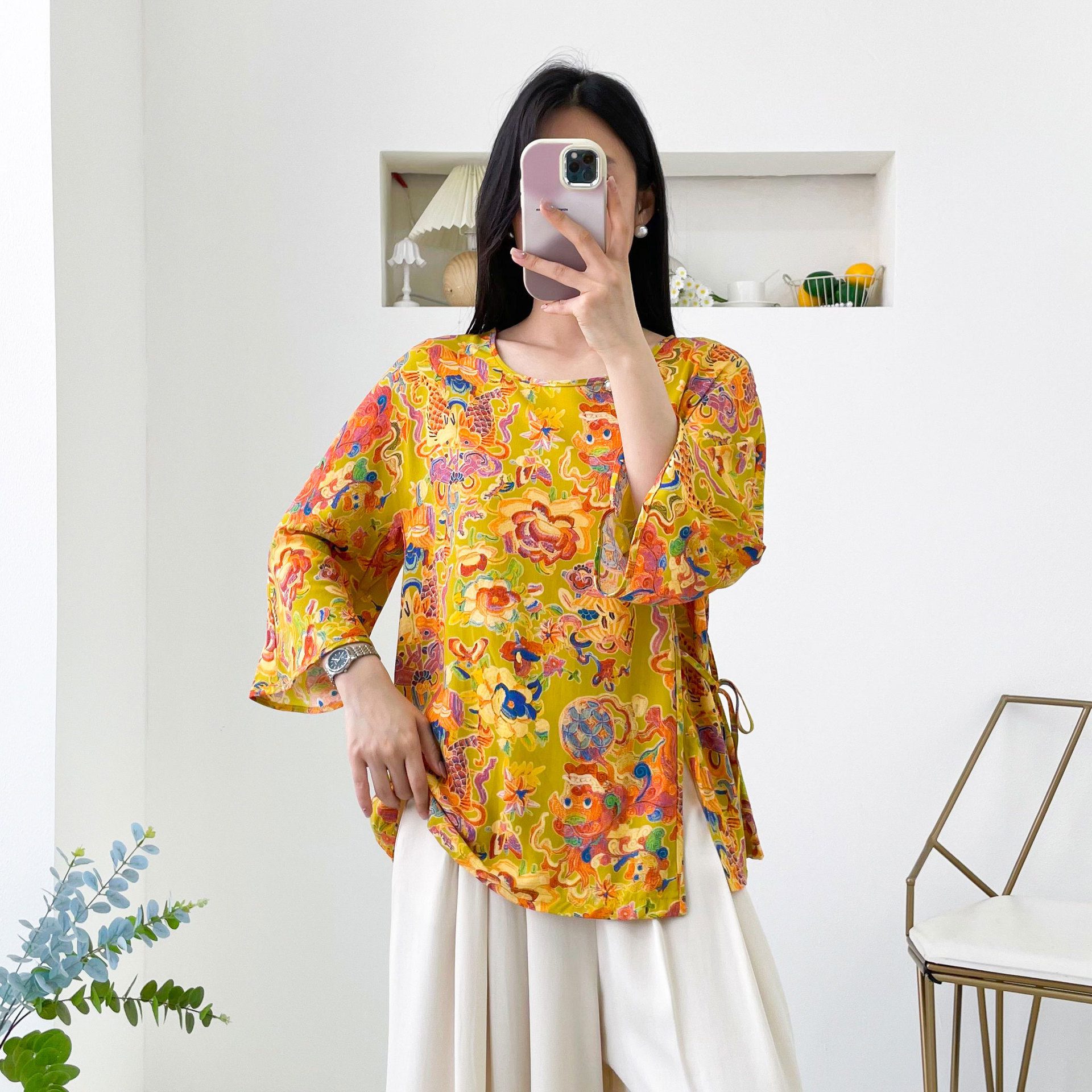 Womens Relaxed-fit Chinese-style Shirt With Flared Sleeves