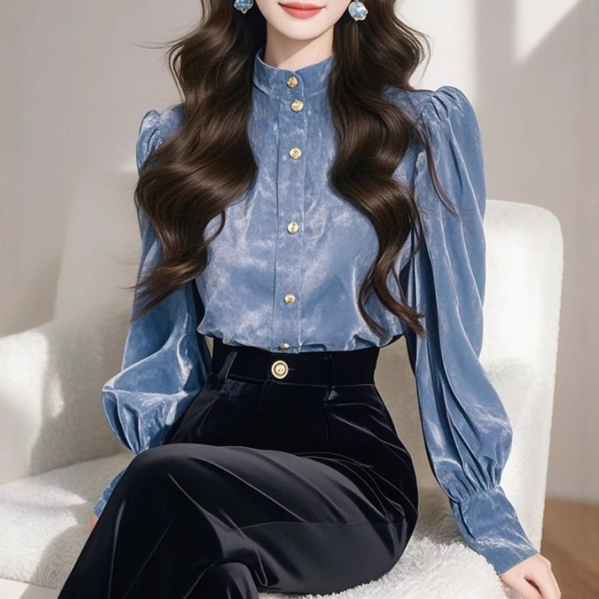 Womens Sophisticated Blue Stand-Collar Velvet Shirt
